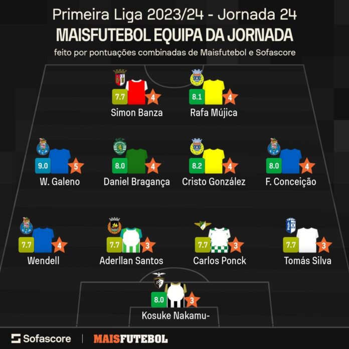 Num fim de semana com três nulos e duas goleadas, o «onze» ideal da jornada 24 da Liga conta com maioria do FC Porto, à boleia do triunfo sobre o Benfica (5-0). Esta formação resulta do somatório das notas dos jornalistas do Maisfutebol em cada jogo, nos estádios, com as da plataforma SofaScore.